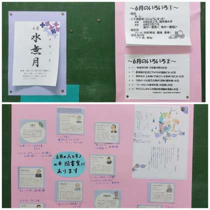毎週木曜日は、学校司書さんが本校に来てくださり、図書館開放や図書館の整備を行ってくれています。図書館に向かう階段の踊り場には、6月にちなんだ出来事や豆知識が掲示されていました。