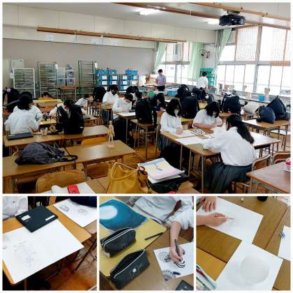 写真は、中庭に飾られた横断幕と、横断幕製作時の風景、美術部の活動の様子です。