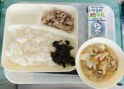 本日の給食には、砂糖や濃口しょうゆ、出汁、しいたけを煮た中に、かつおぶしと刻み海苔を加えて煮詰めた海苔のつくだ煮が登場しました。