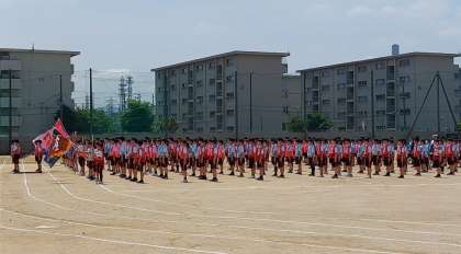 行進練習の様子です。手足をしっかりと上げ行進しています。揃えられた動きや整列した姿がとても綺麗です。