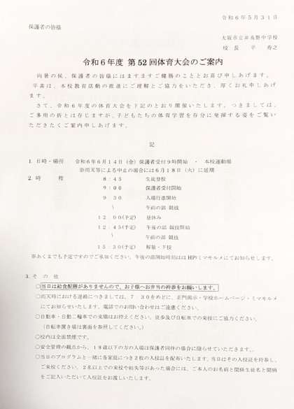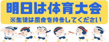明日6月14日(金)は、第52回体育大会です。プログラムの円滑な進行のために、すべての生徒に昼食の持参をお願いしております。