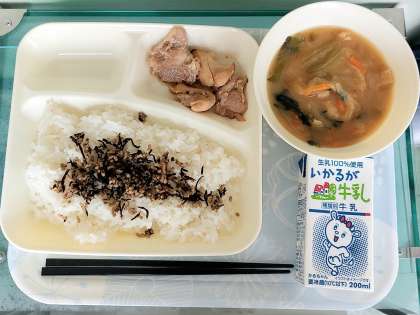 魚ミンチはスケソウダラをミンチ状に加工した食品です。給食では「魚ひじきそぼろ」として、ひじきと一緒に甘辛く味付けしています。しそを加えることにより、しそ特有の香り成分で食欲を増すように工夫しています。