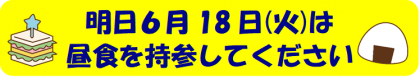 明日6月18日(火)は体育大会の予備日となっていたため、給食の配膳がありません。そのため、全校生徒昼食の持参をお願いいたします。