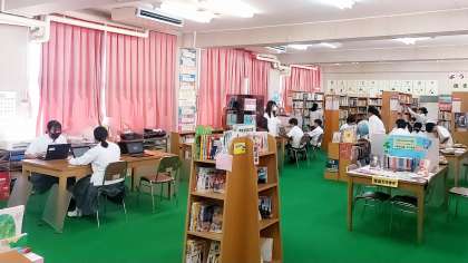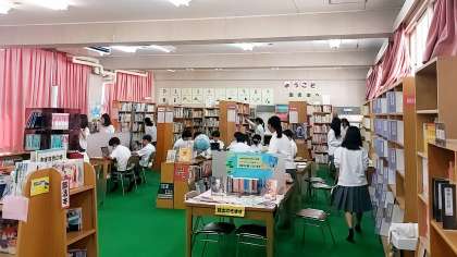 本日1時間目の2年生の国語授業は、図書室で行われていました。夏休みの課題の中に「本にまつわる選択課題」があり、そのための本が選べるようにと、図書室で授業が行われていました。