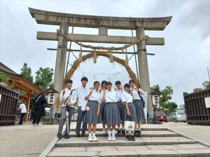 夏らしく涼しい趣向で工夫され、季節感いっぱいのお茶席でした。裏千家茶道の本格的なお茶会のため、お茶席内は撮影禁止。待合席の様子と入口の鳥居前での記念写真です。上菓子と美味しいお抹茶をご覧いただけないのが残念ですが、部員たちにとって貴重な素晴らしい経験になりました。
