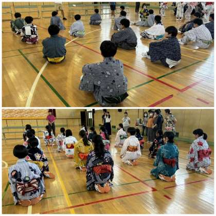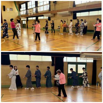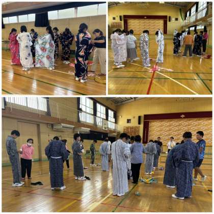 7月17日3・4時間目に、井高野民謡のみなさんにお越しいただき、1年1組の生徒を対象に家庭科と保健体育科授業の一環として、浴衣の着付けと盆踊りを教えていただきました。