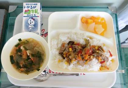 本日の給食は、平野西小学校のみなさんが考えてくれた献立です。赤色や緑色のピーマンを使い、色鮮やかなメニューになっていました。