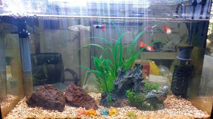 管理作業員室前に、熱帯魚の水槽があります。水槽には「グッピー」と「クーリーローチ」というドジョウ科の熱帯魚がいます。
