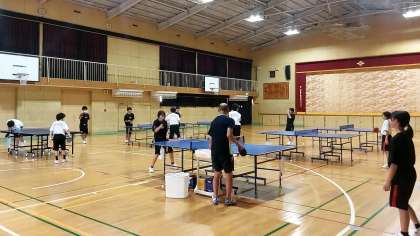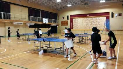 体育会では、卓球部が練習をしていました。網を使って上手にピンキュウを集めている生徒もいました。