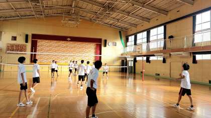 体育館では、レスリング部と有志の生徒がバレーボールをしていました。