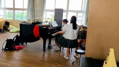 放課後に図書室で行われている学習会の様子を見に行くと、近くの第二音楽室からピアノの音色が聞こえてきました。音楽室を覗くと、2年生の生徒が伴奏の練習をしていました。