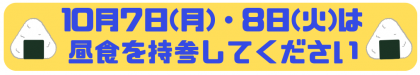 10月7日(月)・8日(火)は、本校の給食を調理してくださっている井高野小学校の学校行事の都合により給食の提供ができないため、ご家庭にて昼食を準備していただき、ご持参をお願いいたします。