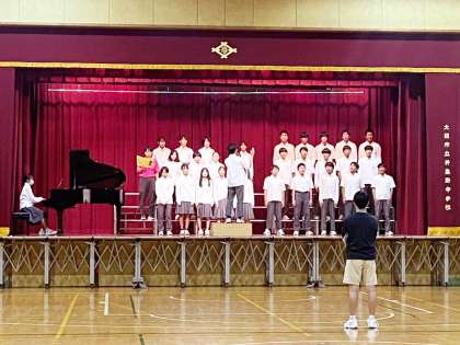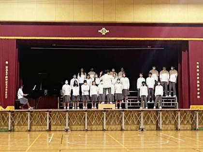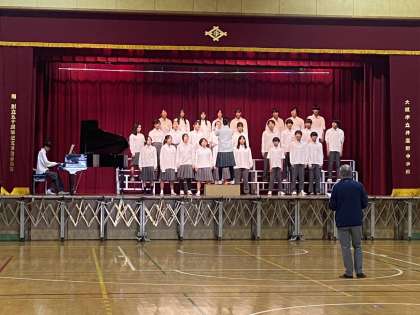 10月24日(木)の合唱コンクールに向け、全学年が各クラスで合唱練習に励んでいます。本日、会場となる体育館の舞台では、2年生が交代で練習をしていました。ピアノの音色と歌声が合わさり、すてきなハーモニーを奏でていました。コンクール当日の合唱が楽しみです。