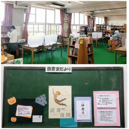 本日の開放にも、多くの生徒が来館してくれました。また、図書館に向かう階段踊り場には、10月の出来事や図書館の特別展示についての案内が掲示されていました。新しい特別展示は、ハロウィンにちなんだ魔女の本です。踊り場の掲示や図書館の特別展示本にも注目してみてくださいね!
