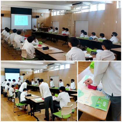 本日、2年生男子の保健体育の時間に、救急救命法の授業を行いました。初めにAEDの大切さについての動画を視聴した後、胸骨圧迫(心臓マッサージ)とAEDの使用方法を学ぶことができるトレーニング教材「あっぱくんライト」を用いて実習を行いました。周囲の確認や声掛けの仕方、呼吸確認や周りへの助けの求め方などを順を追って行った後、正しく圧迫できていると「ピッ」と音が鳴るハート型の心臓部を30回1セットとして一定のペースで圧迫する練習をしました。その後AEDの疑似パットを正しい位置(2枚のパットで心臓を挟む)に貼り、再び胸部圧迫を行いました。