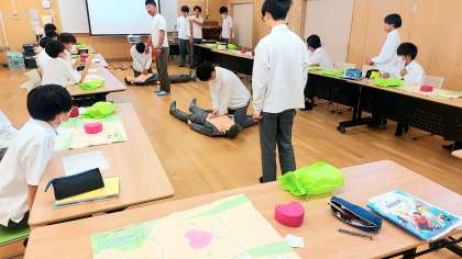教員からは、実際に使う機会が起こらないことが最善ですが、いざその場に居合わせたときに、勇気を持って行動し、協力して人のいのちを助けられる人になって欲しいとお話がありました。