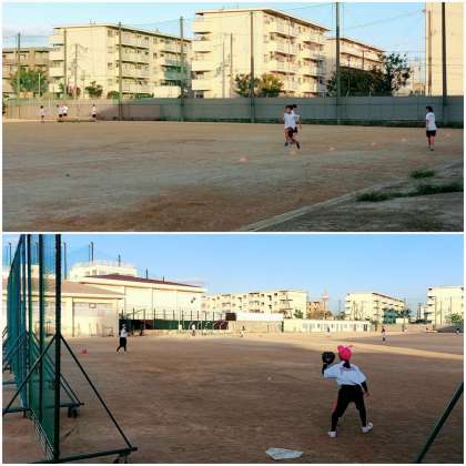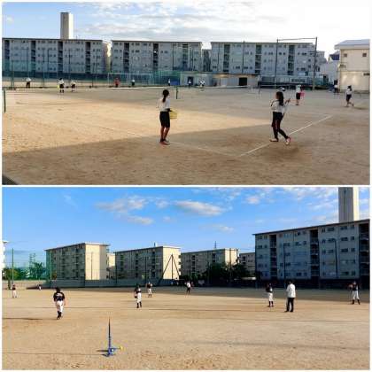 写真はグラウンドの女子ソフトテニス部、野球部、陸上部、女子ソフトボール部の様子です。