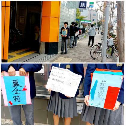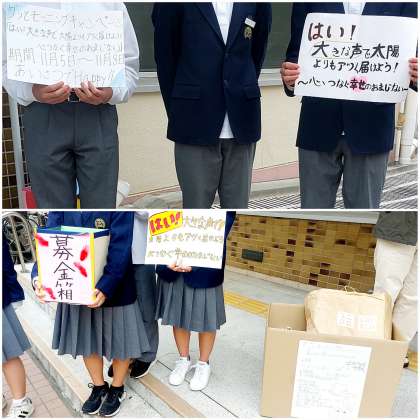 11月5日(火)から井高野小学校、東井高野小学校、井高野駅、井高野中学校の4か所で始まった「グッとモーニングキャンペーン」と「届けよう服のチカラプロジェクト」も、本日11月8日(金)が最終日となりました。最終日の本日も、各活動場所で生徒会と各専門委員会の生徒が、朝のあいさつ運動と合わせて、赤い羽根募金と子ども服の回収を行いました。