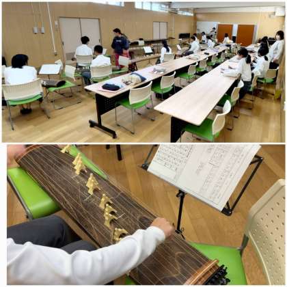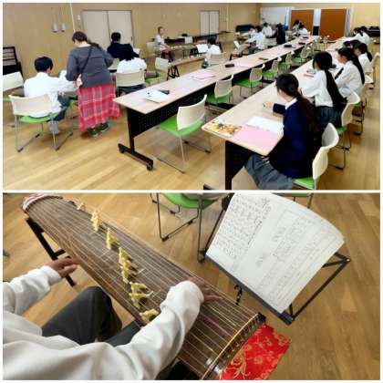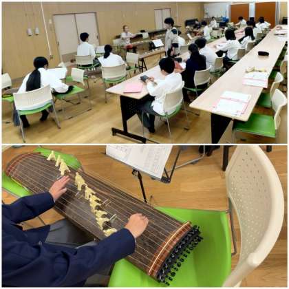 本日11月11日(月)より、講師の先生にお越しいただいて箏の授業が始まりました。本日11日(月)、13日(水)、14日(木)、15日(金)の4日間お越しいただき、1クラスの人数を半数にして、1・2年全クラスの生徒を対象に箏の授業をしていただきます。教室には綺麗な音色が響いていました。