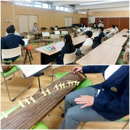 本日は2年生がお箏の体験をしています。左手で膝をたたながら、右手で細かいリズムを弾く練習をしていました。左右で異なる動きをするの難しいですが、丁寧に教えていただきながら上手に弾くことができていました。