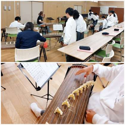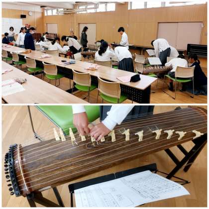 最終日の本日は、1年生がお箏の体験をしていました。平調子(基本調)と乃木調子(平調子から四・六・九・斗の弦を半音上げた調子)の転調にもチャレンジしていました。