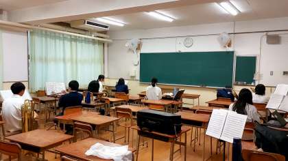 写真は吹奏楽部とレスリング部の活動の様子です。