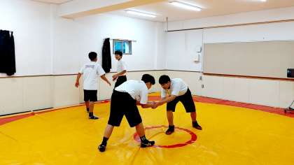 レスリング部では、スパーリング前の握手を交わしていました。相手に敬意をはらう練習や試合前の挨拶です。