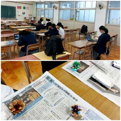 美術部では、松ぼっくりとボトルキャップで小さなクリスマスツリーを作っている生徒がいました。細かい作業ですが、丁寧に色付けや飾りつけがされていました。