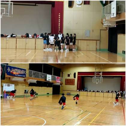 体育館では、女子バスケットボール部と男子バスケットボール部が活動していました。女子バスケットボール部のみんなは、顧問の先生を囲み作戦会議の真っ最中でしょうか?