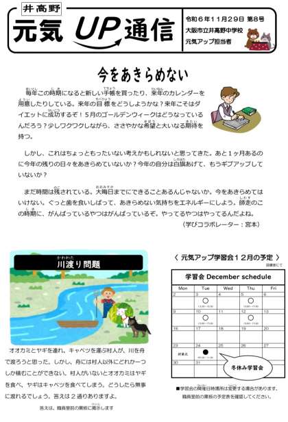12月の放課後学習会の予定や、川渡りクイズも載っています。クイズの答えは職員室前に掲示されているので、ぜひチャレンジしてくださいね!