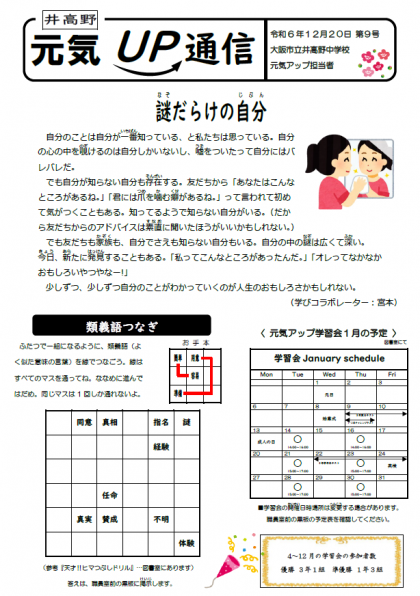 元気アップ通信には、R7年1月の放課後学習会の予定や、今年度4月〜12月の学習会参加者数優勝クラスと準優勝クラスも載っていますので、ぜひご覧ください。