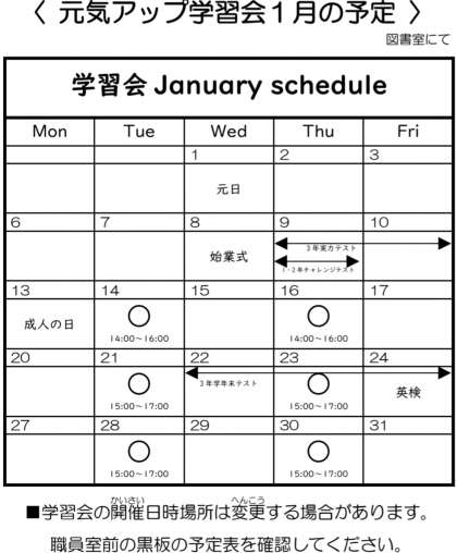 次回の元気アップ学習会は、年明け1月14日(火)です。当日は、5時間目までのため開催時間は14時から16時となります。ぜひ、積極的にご参加ください。