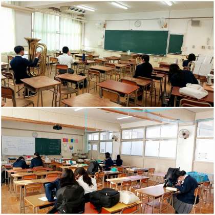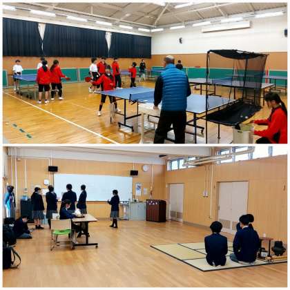 写真は上から順に、卓球部、茶道部、吹奏楽部、美術部の活動の様子です。