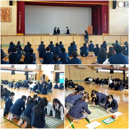 委員生徒司会のもと、舞台上で競技についてのルール説明や諸注意がありました。ユーモアを加えた実演に、楽しく説明を聞くことができていました。その後、各チームに分かれ試合が行われました。担当教員が太鼓を鳴らす度に、体育館が静まり返り、みんな読まれる和歌に耳をこらし、目の前の札を懸命に見つめていました。対戦が終わると互いに向き合い、お辞儀をして礼を取りました。