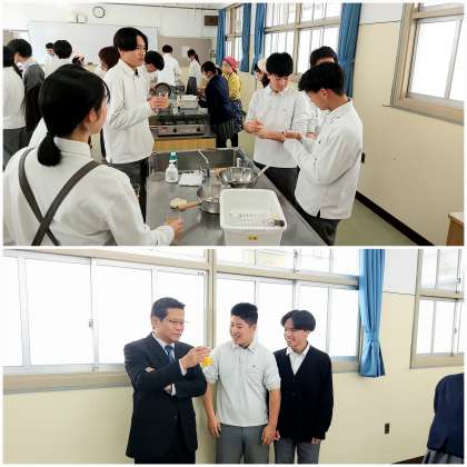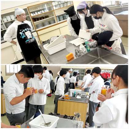 出来上がったジュースを飲んだ生徒たちから「美味しい」「甘い」「ちょっと薄かったかも」と、色々な感想を聞くことができました。見学に来ていた校長先生にも、生徒手作りのオレンジジュースが振舞われました。