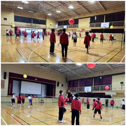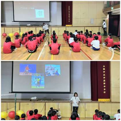 昨日2月6日(木)の6時間目に、1年2組の生徒を対象に障がい理解教育として、パラスポーツ体験を実施しました。パラスポーツについて学んだ後、競技用車椅子と鈴の入った風船を使った「トーエイライトバレーボール」に挑戦しました。