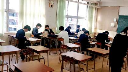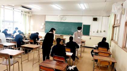本日放課後に、学力向上サポーター主催による「マスマス学習会」を開催しました。第20回目となる今回は「公立入試テスト演習(2) A問題・B問題」と題し、公立高校一般入試のA問題とB問題の模擬試験を実施しました。本番さながらの緊張感の中で、みんな真剣に模擬試験を受けていました。試験終了後は答え合わせをし、振り返りシートを用いて正解できなかった理由を考えました。