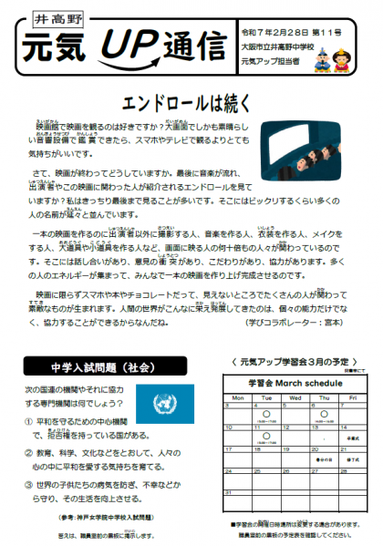 元気アップ通信には、3月の放課後学習会の予定も載っていますので、ぜひご覧ください。掲載されている「中学入試問題(社会)」にも挑戦してみてくださいね!答えは職員室前の黒板に掲示されます。