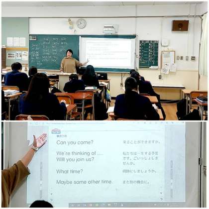まず初めにワークシートを用いて、電話で友人を音楽祭に誘う表現を各自で考えました。模範解答以外にも、今までに学習した表現を用いて様々な伝え方が考えられていました。模範解答では、友人同士のくだけた誘い方や、丁寧な誘い方が紹介されました。その後、ワークシートの例文を英語で聞き、新たに習った単語や表現に印をつけながら確認しました。最後に、待ち合わせ場所や時間を決める表現や、誘いを受け入れる表現、電話の受け答えが紹介されました。今までにバラバラで習った表現を組み合わせて、新しい表現の仕方ができることを学習しました。