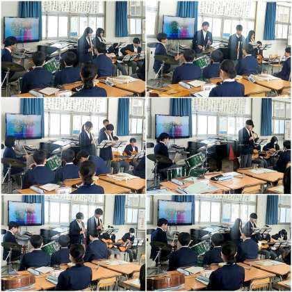 本日2時間目に、3年2組の生徒を対象に音楽科の研究授業を実施しました。テーマは「カントリーロードでアンサンブルをしよう!」です。グループに分かれ、リコーダー、ギター、ドラム、タンバリン、トライアングルを用いて合奏をしました。めあては「様々な楽器に触れ、グループで演奏する中で自分の役割を知ろう。」です。本時の目標は、中学校学習指導要領音楽の示す第3学年[A表現]にある、全体の響きや各声部の音などを聴きながら、他者と合わせて演奏する技能を習得し、他者の前で発表する中で自分の役割を理解することです。
