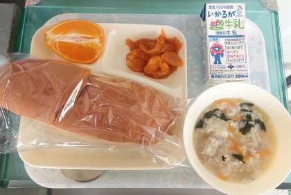 本日の給食の中華粥は、米のほかに肉だんご、チンゲン菜、大根、にんじん、しいたけが入っていました。チキンブイヨン、醤油、塩で味付けし、ごま油で風味が付けられていました。