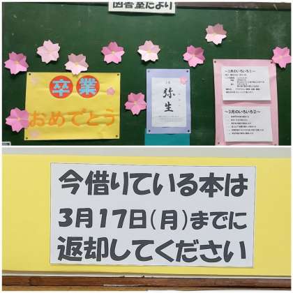 また、図書館に向かう階段の掲示板には、学校司書さんによる卒業をお祝いする飾りが掲示されていました。