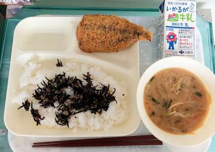 本日の給食では、「いわしフライ」が出ました。骨ごと食べられるため、骨や歯を丈夫にするカルシウムもたくさん摂ることができます。