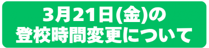 標題にありますように、明後日3月21日(金)の登校時間が変更になります。委員会に所属している生徒は午前8時45分登校、所属していない生徒は午前8時55分から午前9時05分までに登校となりますので、お子さまにお声掛けをよろしくお願いいたします。