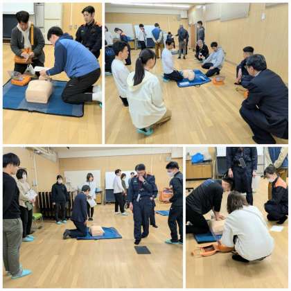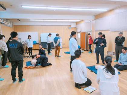 続いて、東淀川消防署の方にお越しいただき、救急救命講習を行いました。映像研修の後、お手本を見せていただき、参加した教職員が実技研修を行いました。意識確認の仕方や胸骨圧迫の仕方、AEDの使い方などをご指導していただきました。