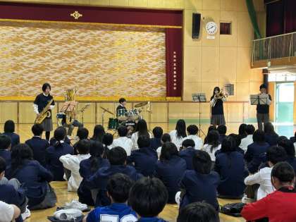 写真は、代表あいさつと、吹奏楽部、美術部の紹介の様子です。