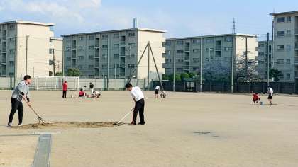写真は、レスリング部、卓球部、野球部の様子です。野球部は、雨でぬかるみ、水溜まりができてしまったグラウンドの整備をしてくれていました。