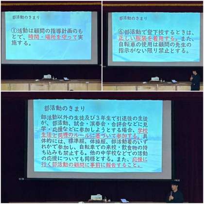○部活動で登下校するときは、正しい服装を着用する。また、自転車の使用は顧問の先生の指示がない限り禁止とする。