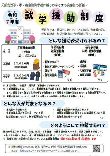 この制度は、保護者負担の軽減を図るために、学校教材費や修学旅行費等を支給する制度です。申請をご希望の方は、リーフレットをご確認いただき期限までに申請書類をご提出ください。