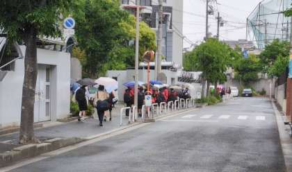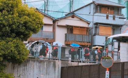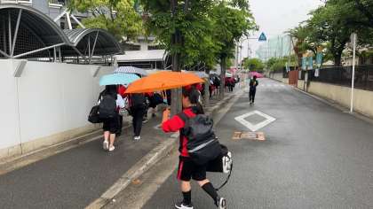あいにくの雨となりましたが、みんな元気ににこやかにバス乗り場へ向かいました。